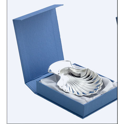 Concha de bautismo en acero plateado con base para grabar una inscripción.