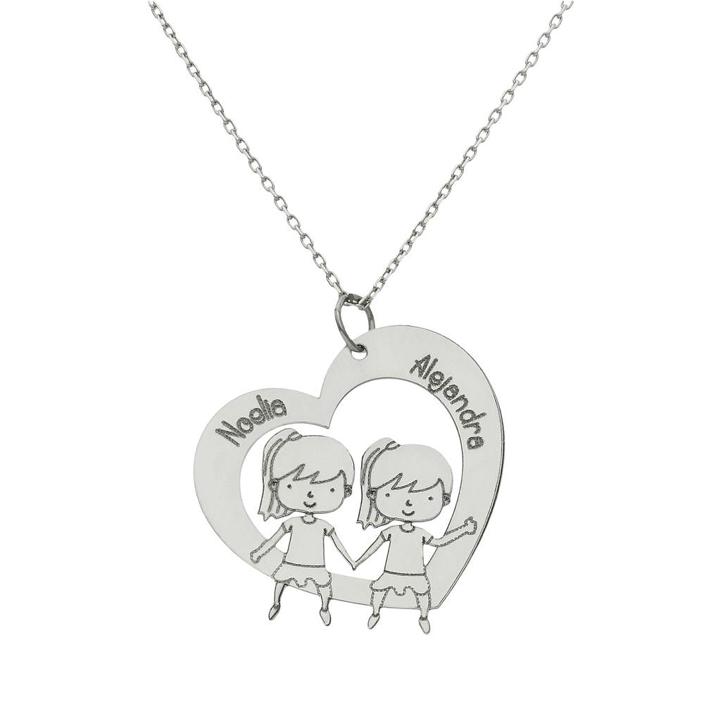 Gargantilla corazón + niñas en Oro blanco 18 Kl. personalizable con nombres.