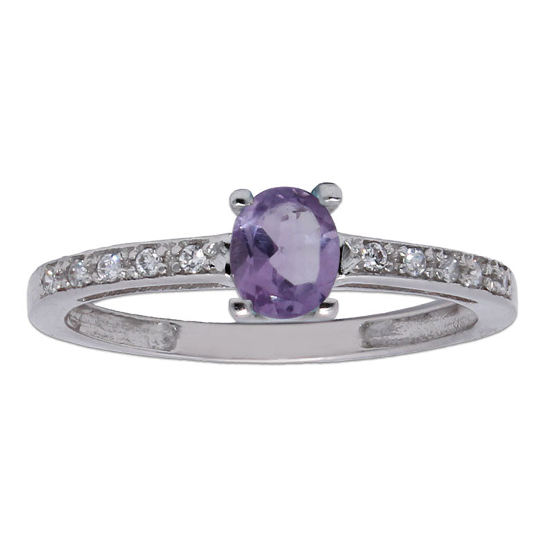 Sortija en Oro Blanco de 18 Kl. con circonitas y piedra central en color amatista.