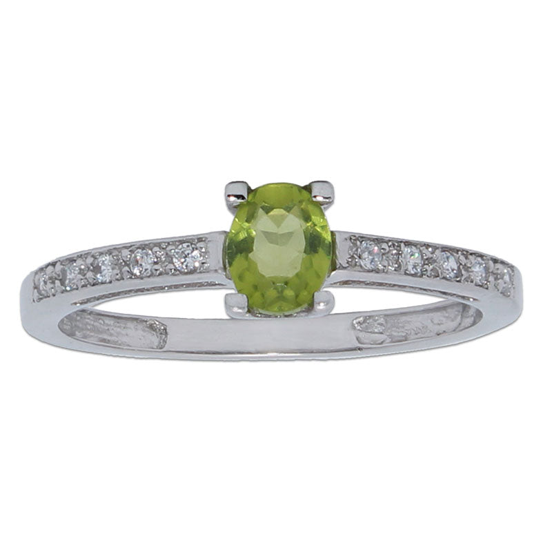 Sortija en Oro Blanco de 18 Kl. con circonitas y piedra central en color peridot.
