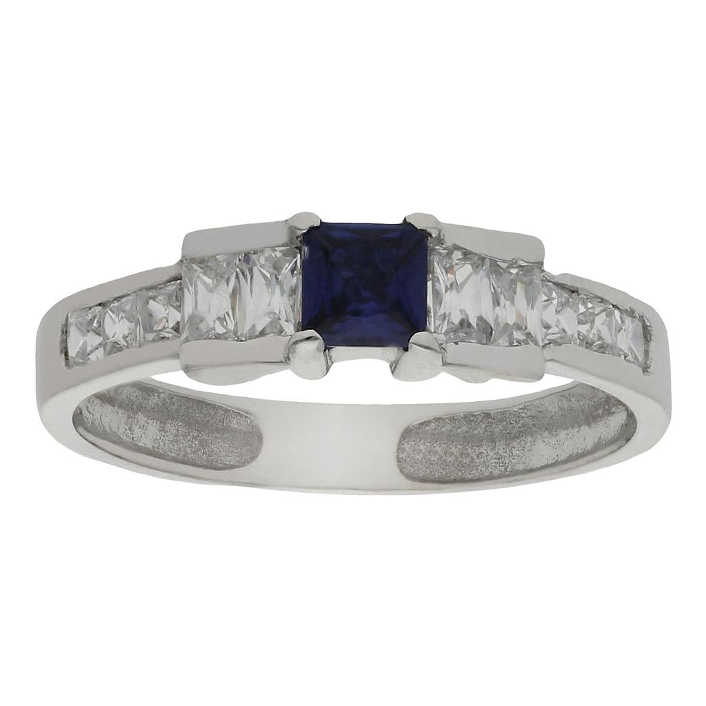 Sortija en Oro blanco de 18 Kl. con circonitas en talla baguette y zafiro fino. Medida piedra central: 4x4mm.